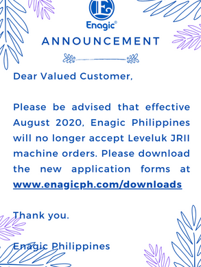 Please be advised that effective August 2020, Enagic Philippines will no longer accept Leveluk JRII machine orders. Please download the new application forms at www.enagicph.com/downloads