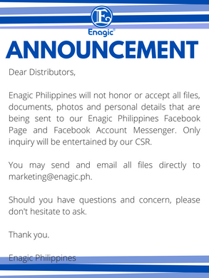 Enagic Philippines will not honor or accept all files, documents, photos and personal details that are being sent to our Enagic Philippines Facebook Page and Facebook Account Messenger. Only inquiry will be entertained by our CSR.